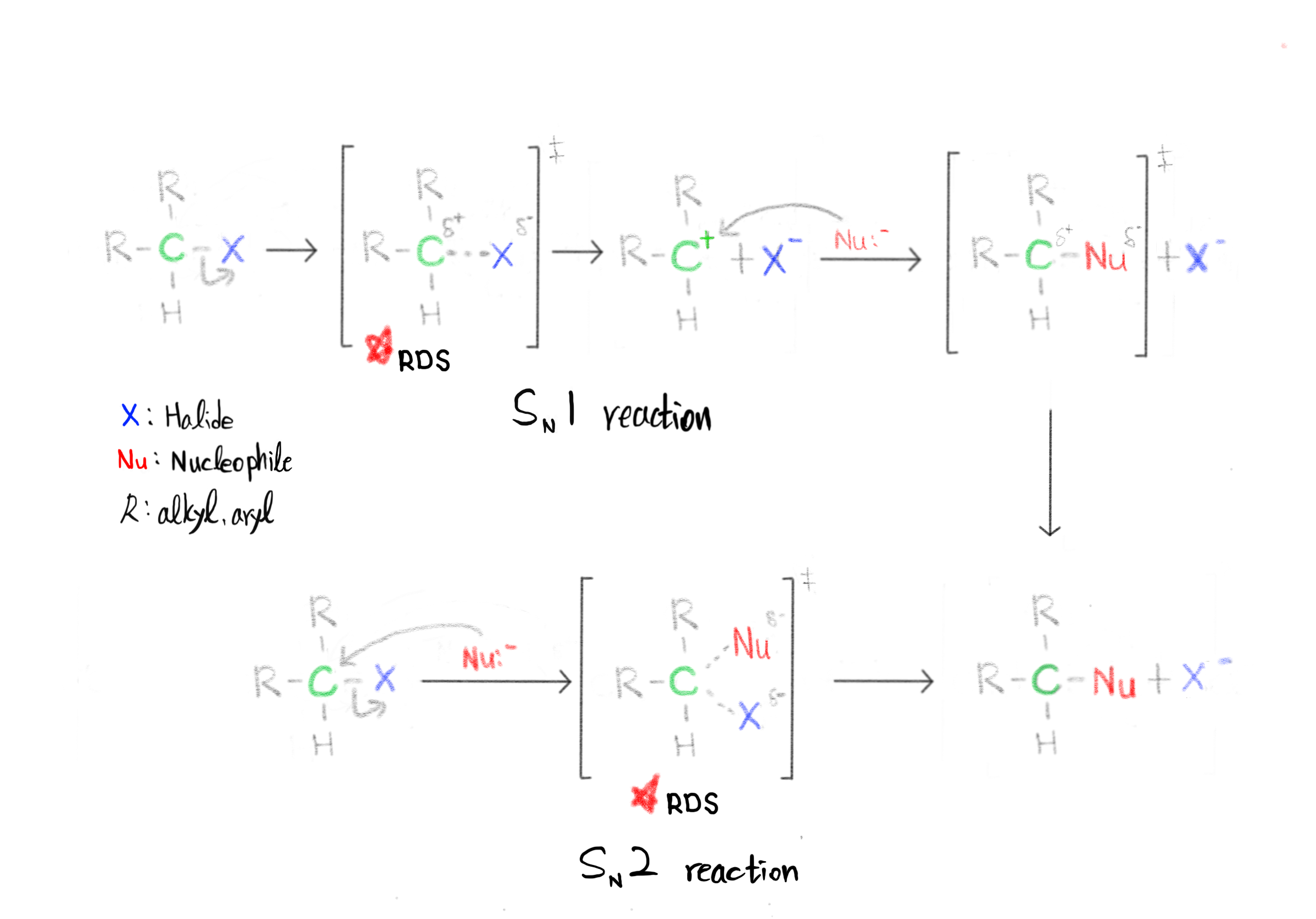 SN1과 SN2 반응의 메커니즘을 보여주는 이미지입니다.