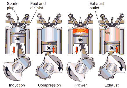 - 배기 (Exhaust): 연소 후 남은 배기가스가 배기 밸브를 통해 실린더 밖으로 배출됩니다.