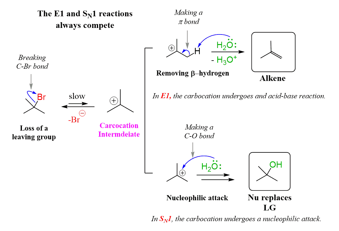 E1과 SN1 반응 간의 경쟁을 설명하는 이미지입니다.