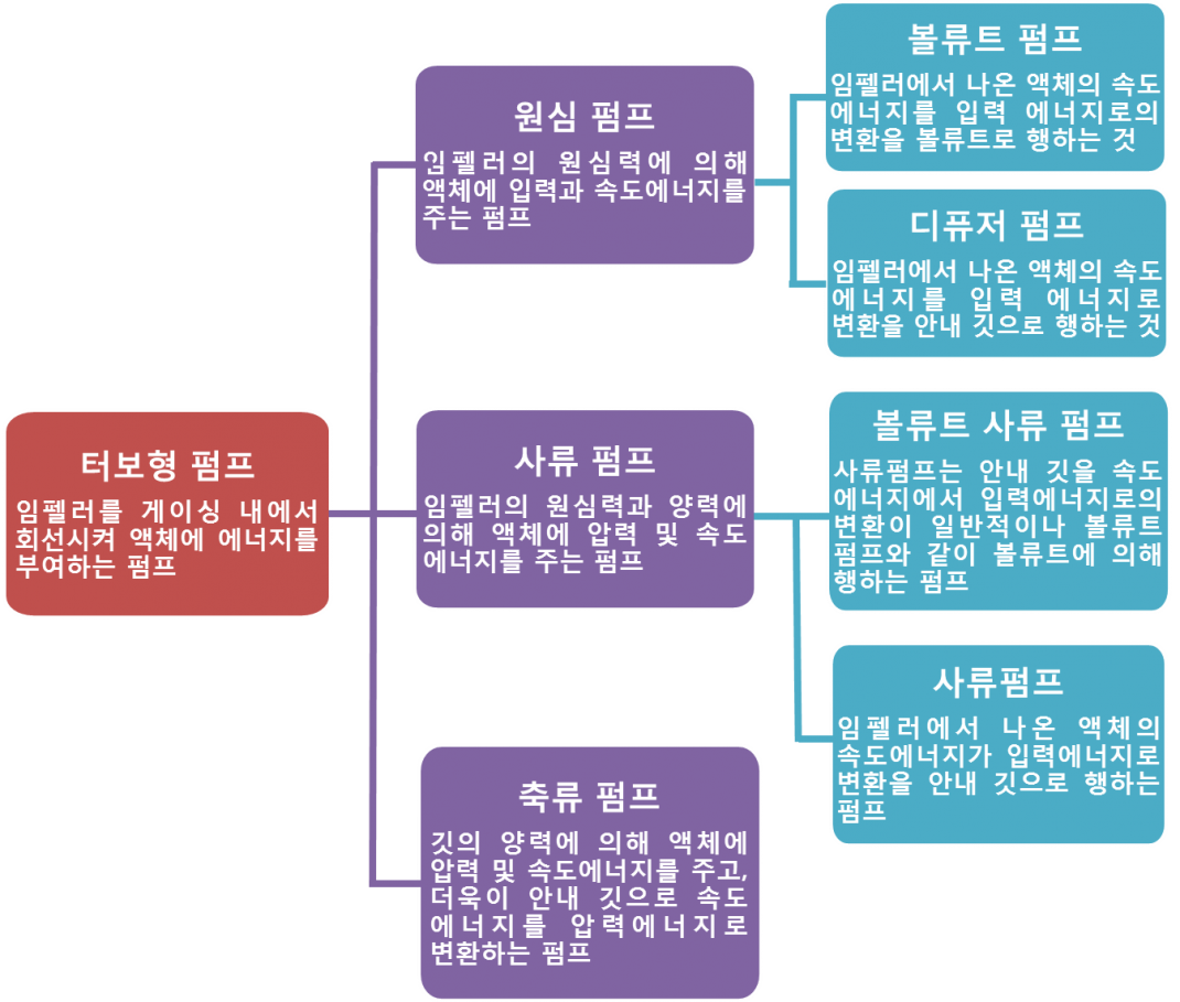 펌프는 크게 원심 펌프, 사류 펌프, 터보형 펌프, 용적형 펌프로 나눌 수 있습니다.