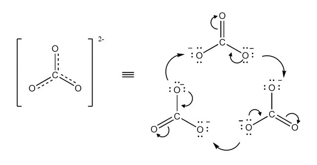 탄산 이온(CO3^2-)은 세 개의 산소 원자가 중앙의 탄소 원자와 결합된 구조를 가지고 있습니다. 이 이온은 두 개의 공명구조를 가지며, 이 구조들은 전자가 어떻게 이동하는지를 보여줍니다.