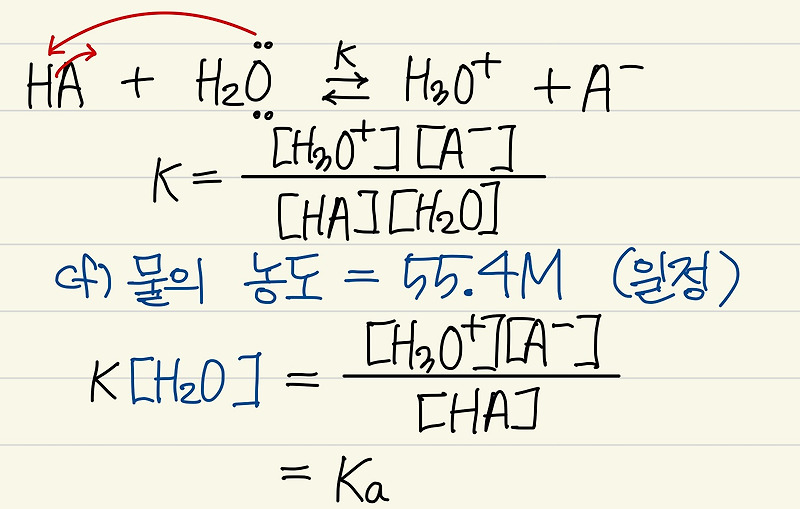 마지막으로, 약산의 해리 반응을 살펴보겠습니다. 약산(HA)은 물에서 해리되어 수소 이온(H₃O⁺)과 짝염기(A⁻)를 생성합니다. 이 과정에서 평형 상수가 정의되며, 이는 반응의 방향성을 결정짓는 중요한 요소입니다.