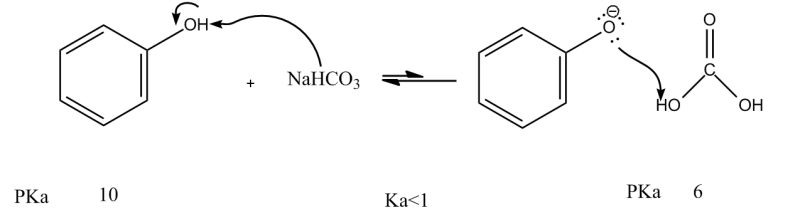 두 번째 예시는 페놀과 중탄산나트륨의 반응입니다. 페놀은 pKa가 10인 약산으로, 중탄산나트륨과 반응하여 페녹사이드 이온을 형성합니다. 이 반응은 가역적이며, 생성된 페녹사이드 이온은 중탄산과 상호작용하여 새로운 화합물을 생성합니다.